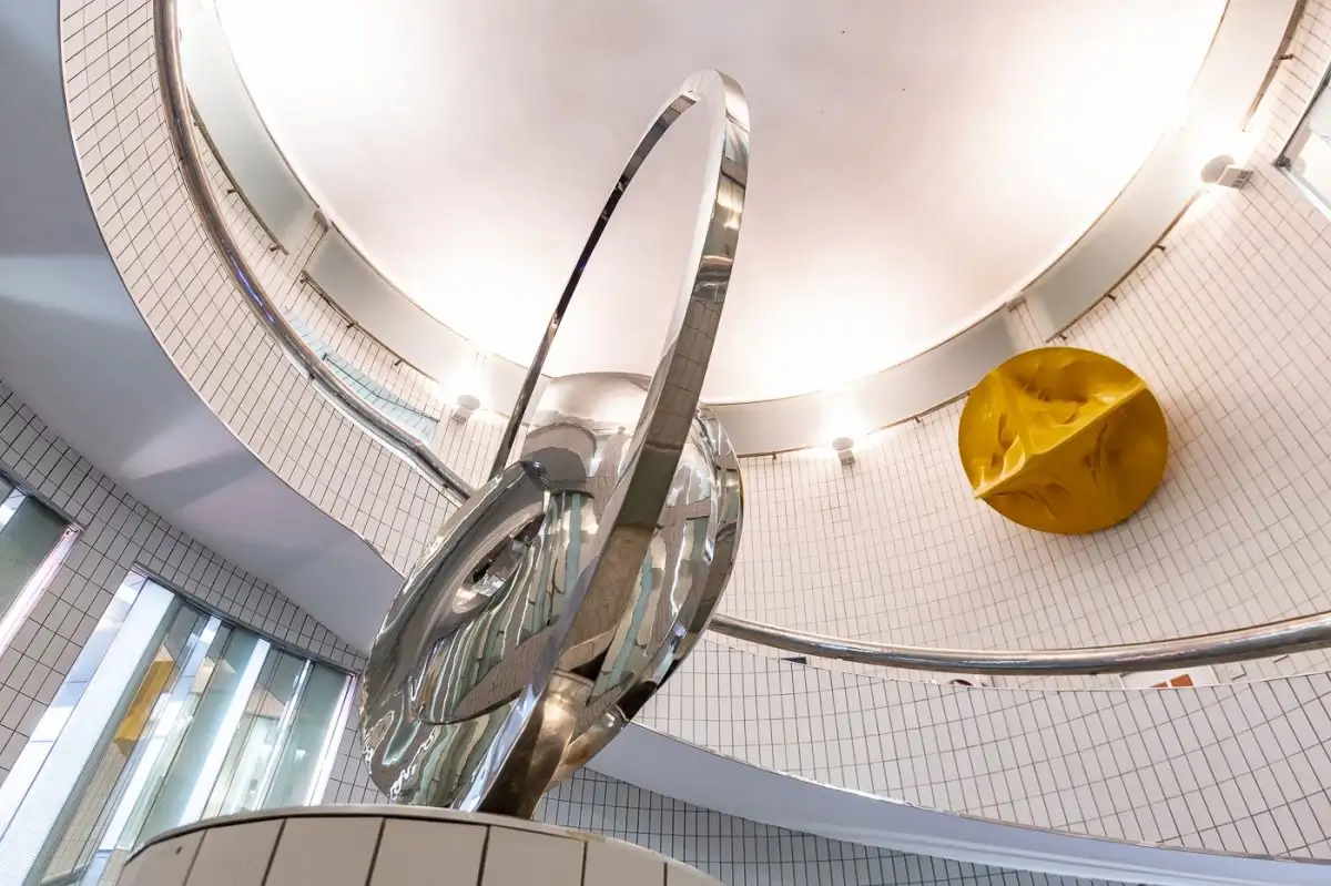 Un edificio particolarissimo caratterizzato da un grande cilindro centrale che collega i diversi piani, dove sono collocati gli spazi abitativi, quelli di studio e quelli espositivi.