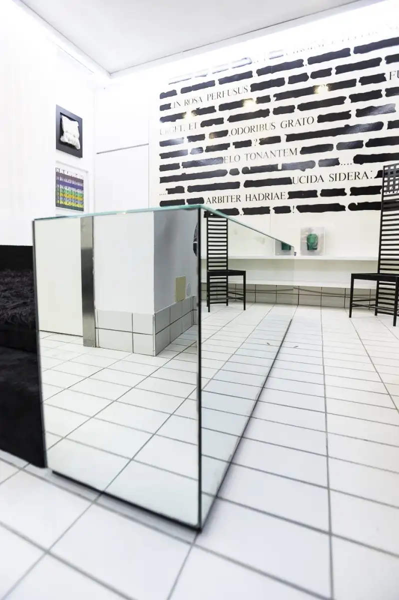 Un’architettura che rivela la sua anima spazialista nelle pareti bianche o trasparenti, negli specchi e nelle luci al neon che smaterializzano gli spazi, dando a chi si trova all’interno della villa la sensazione di una diversa dimensione.