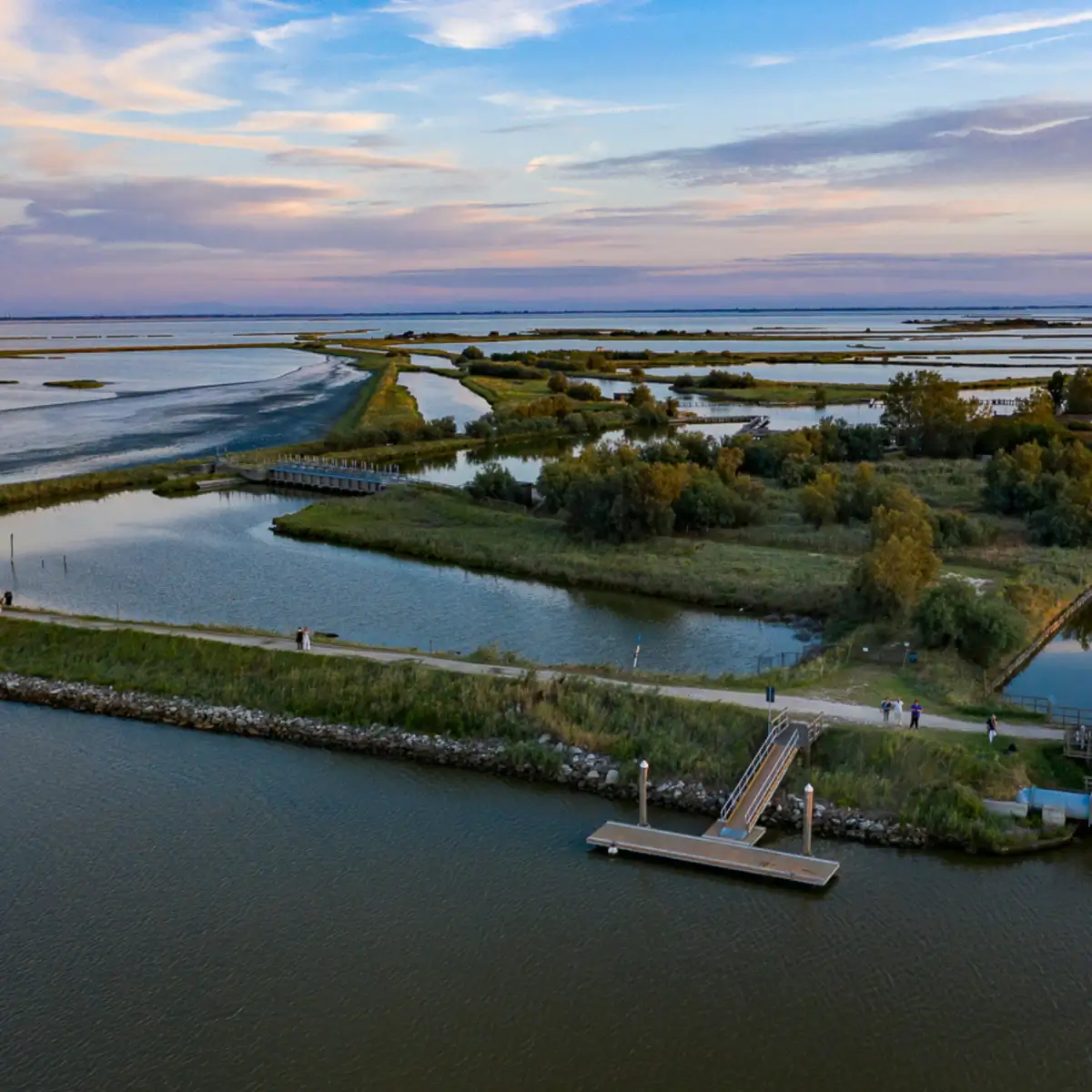 Da Porto Garibaldi si raggiungeranno le Valli di Comacchio in motonave per un'escursione molto amata dalle famiglie e dai birdwatchers. Si attraverserà Valle Fattibello, rifugio di numerosissime specie di uccelli acquatici e riserva di straordinaria valenza paesaggistica, giungendo fino alla Stazione di pesca Foce. Durante la navigazione sarà servito un ottimo aperitivo circondati dalla magica atmosfera del tramonto sulle Valli.