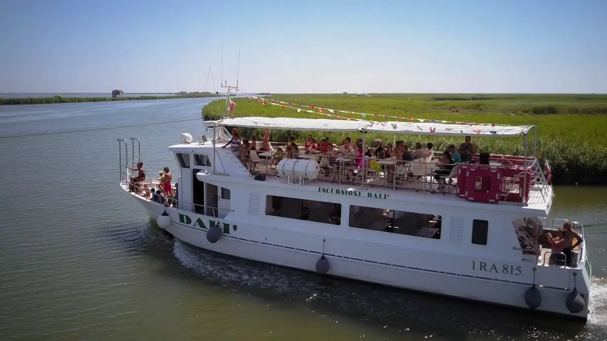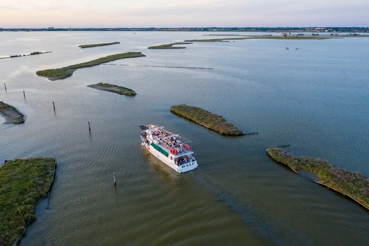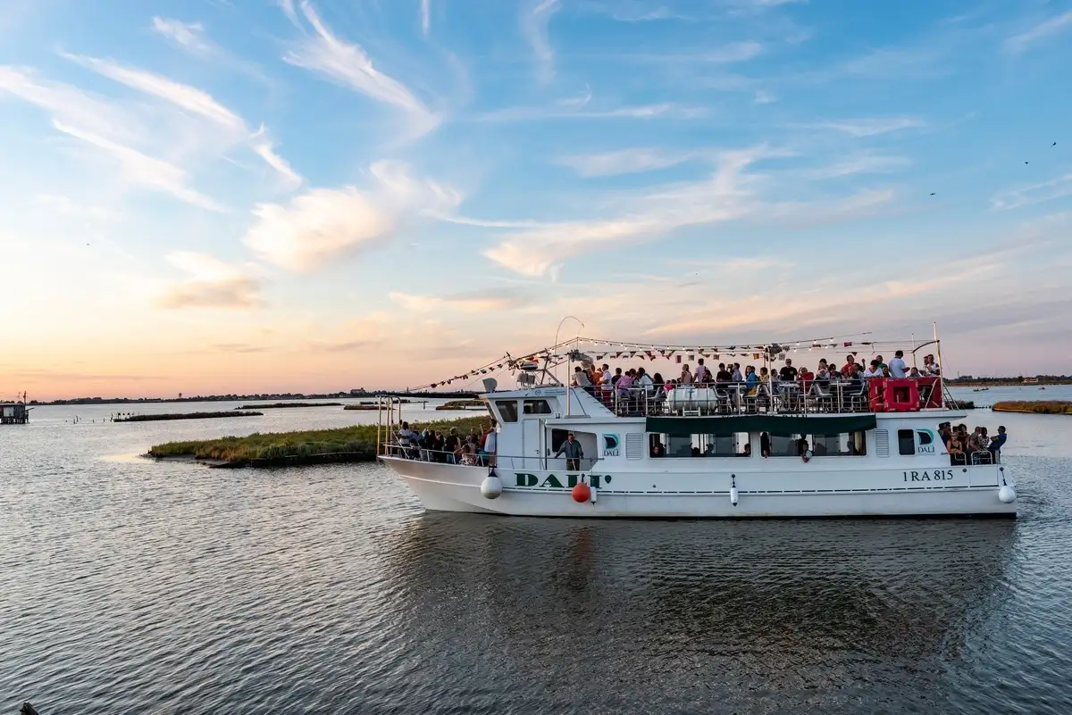 Da Porto Garibaldi si raggiungeranno le Valli di Comacchio in motonave per un'escursione molto amata dalle famiglie e dai birdwatchers. Si attraverserà Valle Fattibello, rifugio di numerosissime specie di uccelli acquatici e riserva di straordinaria valenza paesaggistica, giungendo fino alla Stazione di pesca Foce. Durante la navigazione sarà servito un ottimo aperitivo circondati dalla magica atmosfera del tramonto sulle Valli.