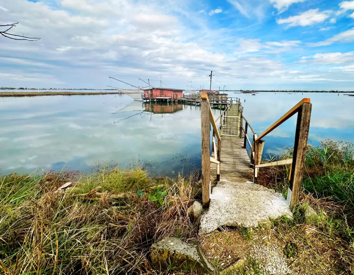 Proseguendo (1 km e ½ circa) si imbocca la prima strada alberata a sx; si procede fino allo stop dove si gira di nuovo a sx e si percorre la strada per 2,5 km; in fondo si gira a dx costeggiando l argine di Valle Fattibello (Strada Foce), al termine si incontra un ponte di ferro (a senso di marcia alterno). Li si è giunti al luogo di imbarco.